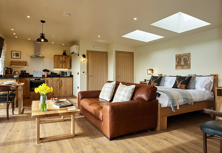 The south-facing deck provides an ideal spot to admire the scenic surroundings, with a hot tub perfectly positioned to take in the expansive views of the surrounding fields — a perfect setting for an evening drink.