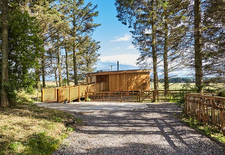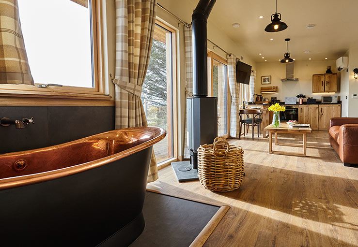 In addition to a modern shower room with a spacious walk-in shower, the lodge boasts a freestanding, double-ended copper bathtub in the main living area, perfect for long, relaxing soaks.