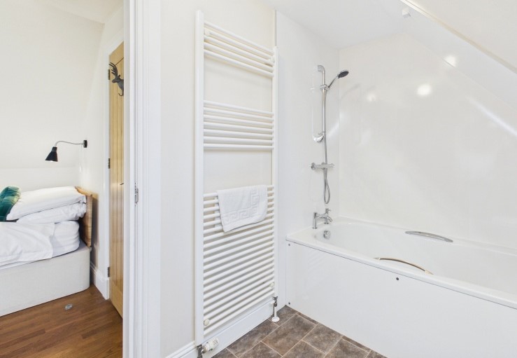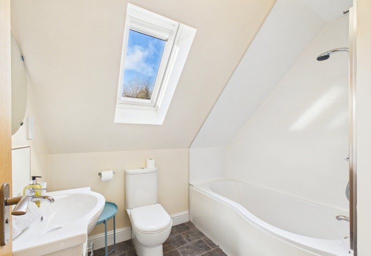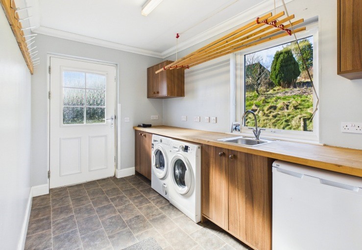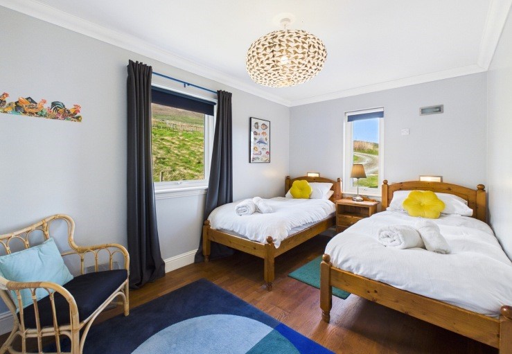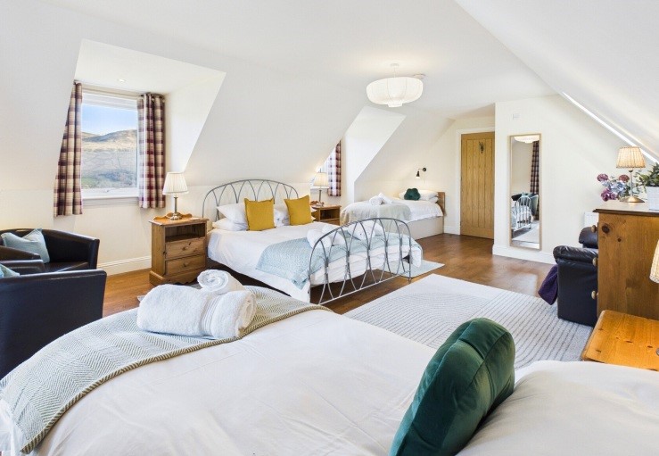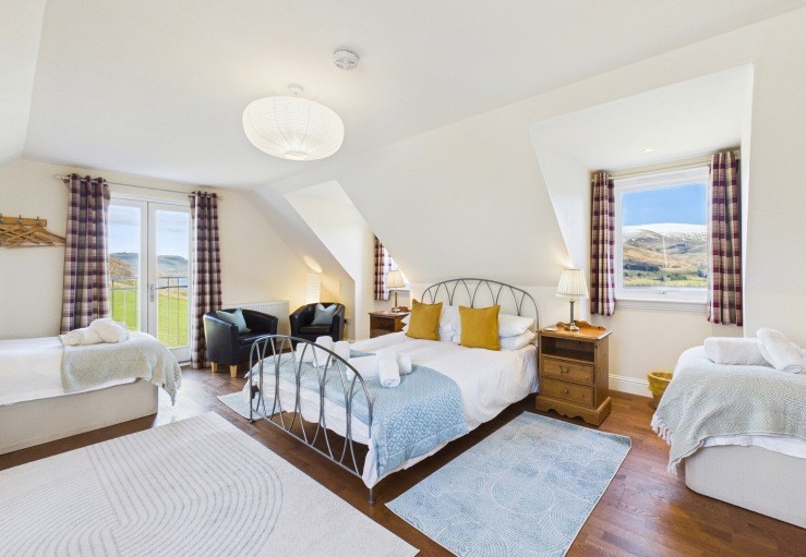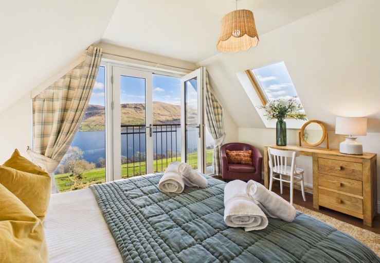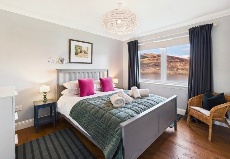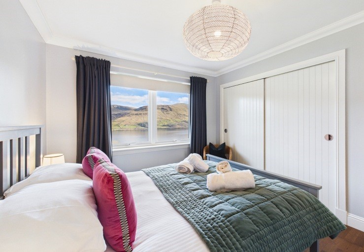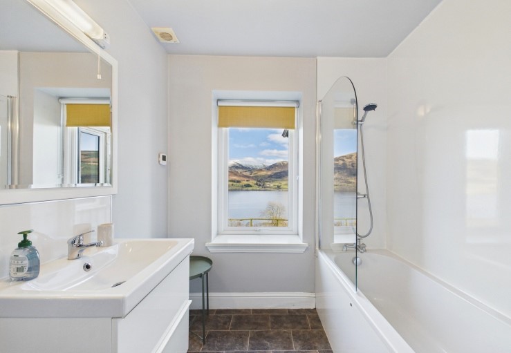 The colourful kitchen is well-equipped with everything easily to hand and the huge gas range cooker makes light work of creating tasty meals. It is supplemented by a utility room with washing facilities and a handy pulley for drying clothes. Also on this level is a double bedroom with a king-size bed and a loch vista from the windows, a pretty twin room and a modern bathroom with views to admire even whilst soaking in the tub. The study opposite this bathroom provides a calm and comfortable space for those wanting to sit down and do some work or escape the kitchen and read a book in peace!