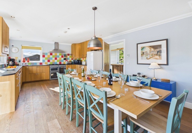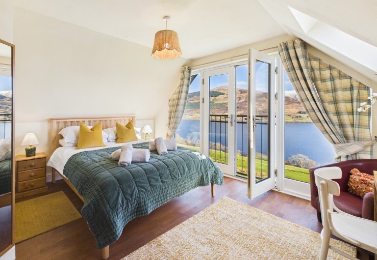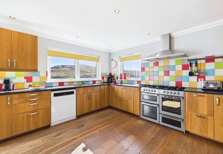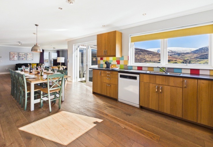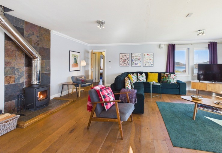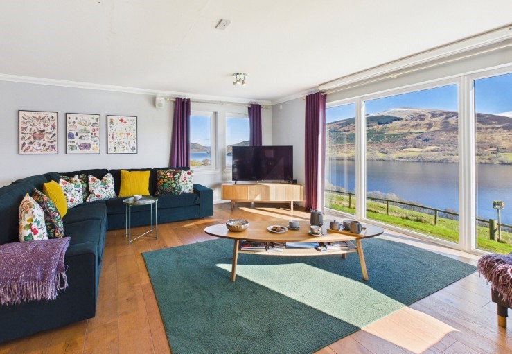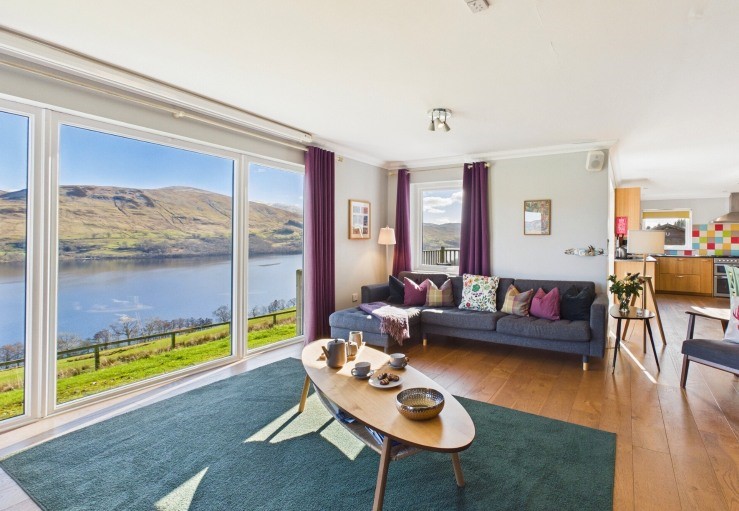 Open plan living is at the heart of the home with the sitting, cooking and dining areas all together in a spacious and bright, L-shaped room. A fire crackles away in the wood-burning stove and the comfy sofas have been positioned perfectly for taking in the amazing view of the loch that is showcased by huge windows on two sides. Doors by the dining table lead out to a delightful decked seating area.
