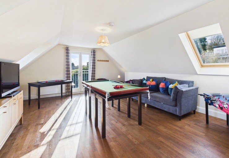 Upstairs the master, en suite double bedroom has a stunning, glass gable end with a Juliet balcony to fully appreciate the dramatic loch scene from. At the other end of the house, a spacious and bright family room has been laid out with a king-size double bed, two single beds and an en suite bathroom. There is also a games room upstairs that has a mini snooker table, a table football table and a bath/shower room off it.