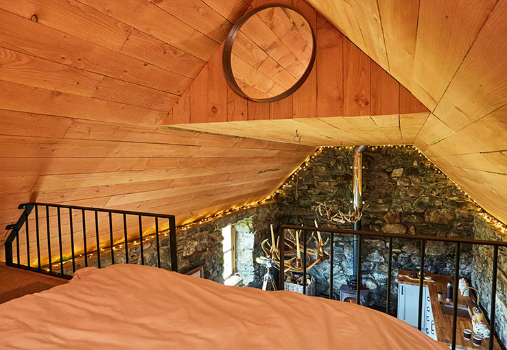 The bothy sleeps 2 with a cosy double bed on the mezzanine floor, accessed via a vertical stair, with barriers installed at the edge of the bed for your comfort.