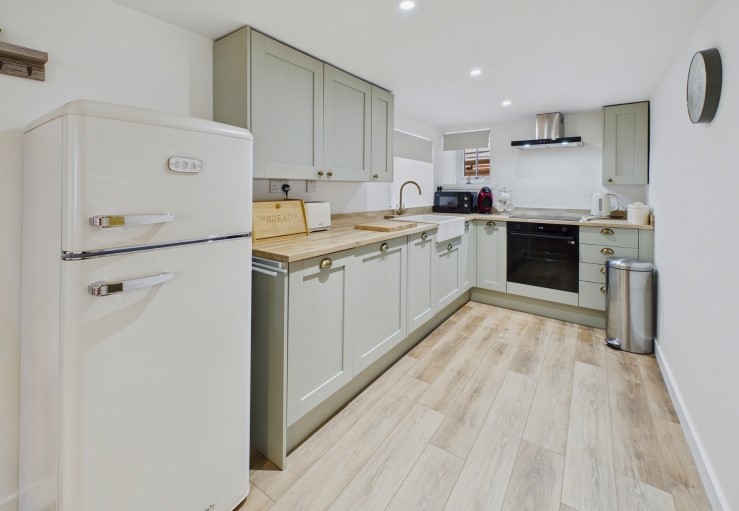 Open plan living area with wood-burning stove, Smart TV (access to Disney+), DVD player, Google home smart speakers, electric cooker, fridge/freezer, washing machine, Dolce Gusto Coffee Machine and microwave