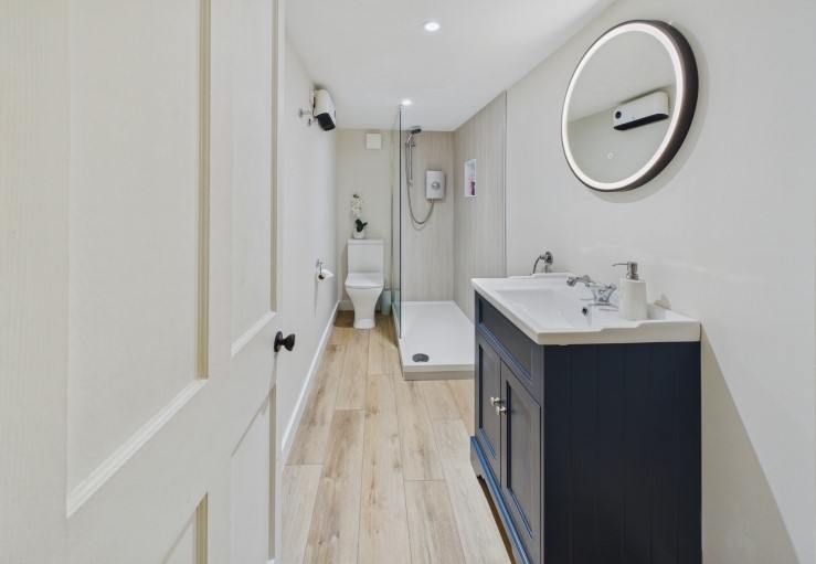 Shower room with WC and wash basin.