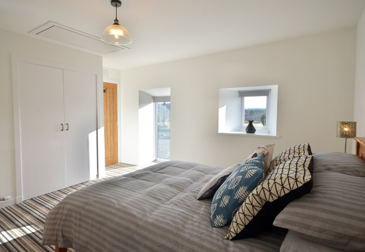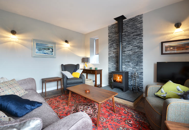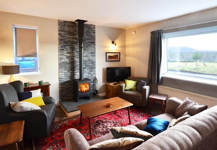 The inviting kitchen is a delightful place to gather together for meals with views out towards Movern and a further wood-burning stove in the corner that warms the place through. A little utility room off the kitchen houses the laundry facilities.