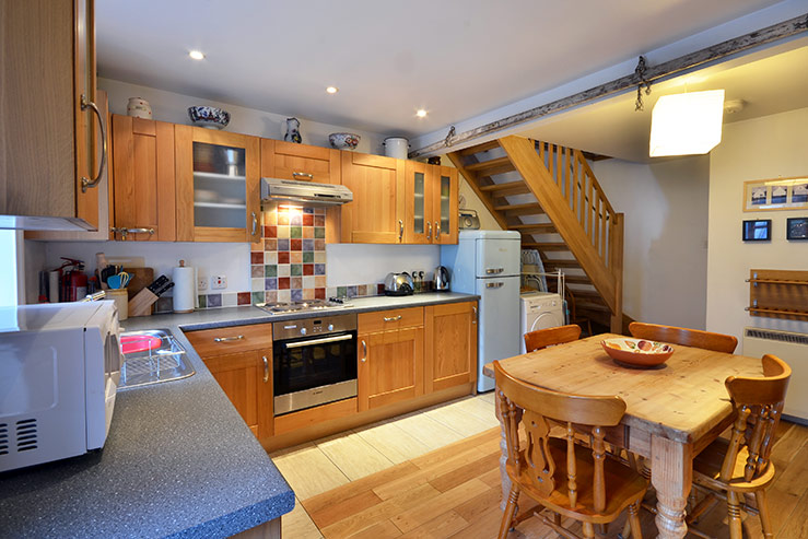 Downstairs the modern dining kitchen so well-designed and attractive, with a wood-burning stove, that guests may well be tempted to spend more time here than just for cooking and eating. There is also a handy shower room with WC on the level.