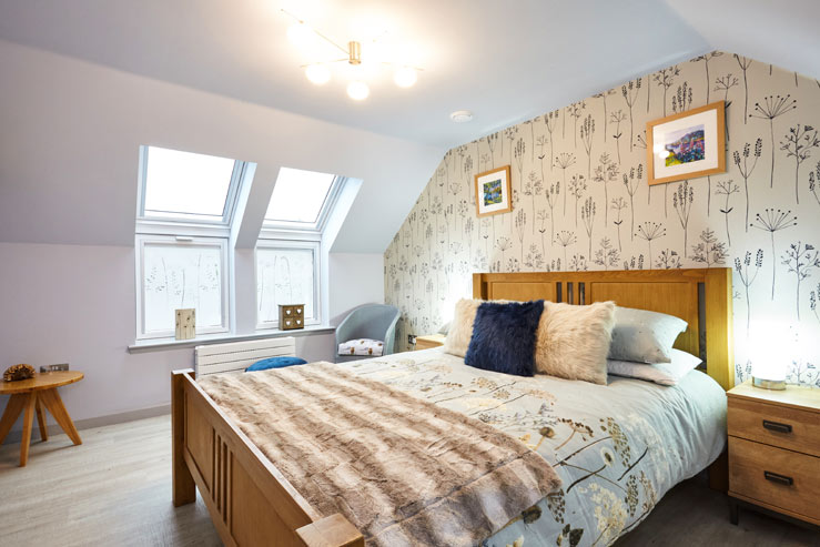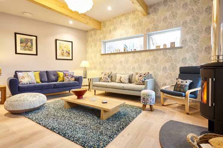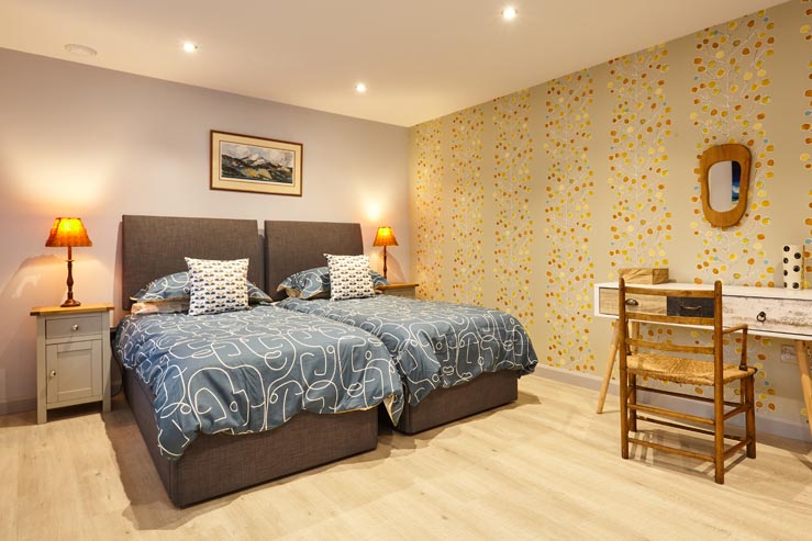 In order to fully unwind, pick a sofa to sink into in the colourful sitting room and take advantage of the wood-burning stove that keeps it toasty throughout. Also on this level is a roomy and bright twin bedroom that makes use of the sleek shower room next door.