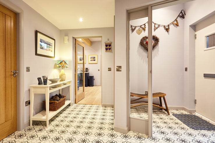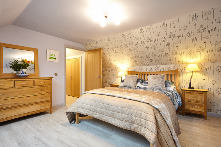 Clad in its namesake larch panelling, this substantial house greets guests with its inviting entrance hall that hints at the delights to be found within. The heart of the house is the huge open plan kitchen/dining room that lends itself very well to socialising, where everyone can gather together around the dining table for a bite or a catch up on the day’s activities. Large windows and high ceilings emphasis the feeling of space and just off it is a utility room that is great for cleaning up after muddy walks as it has a door in from the garden.