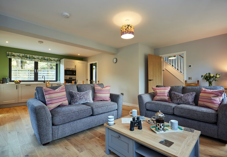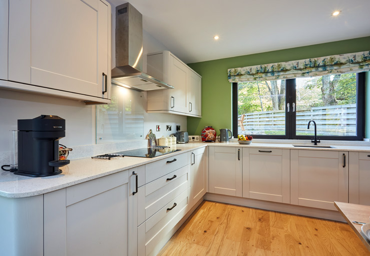 Accessed down a short driveway next to the owner’s cottage, this cabin-style house has two entrances - either into the hallway, or through a well-stocked utility room, which as well as a washing machine and tumble dryer, boasts a wine fridge and an ice-maker. This leads into a light and welcoming, open-plan kitchen, dining and living space, with a woodburning stove and large windows overlooking the river - the ideal cosy space for cooking, relaxing and chatting.