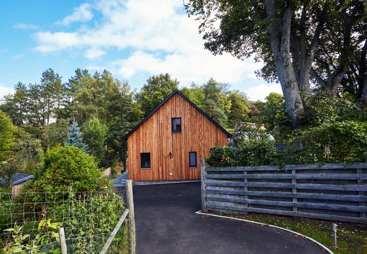 A large hard-standing area provides plenty of space for parking, alongside a wooden shed equipped with power and lighting, providing storage for bikes and skis.