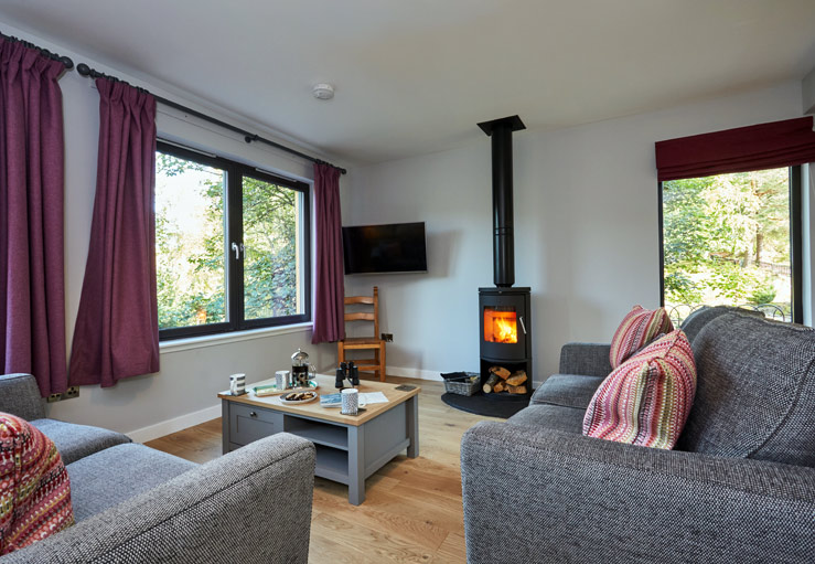 Open plan living area with wood-burning stove, TV, fridge/freezer, induction hob, electric oven, dishwasher, microwave, Nespresso coffee machine etc