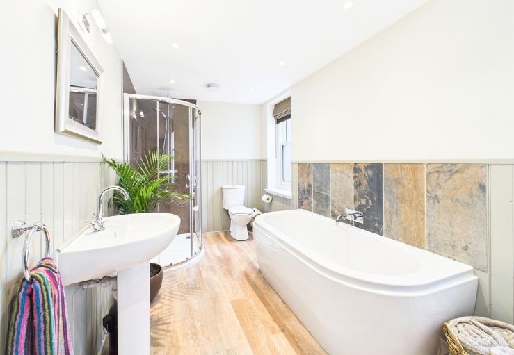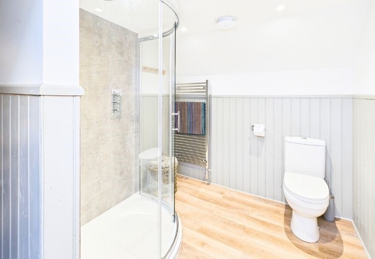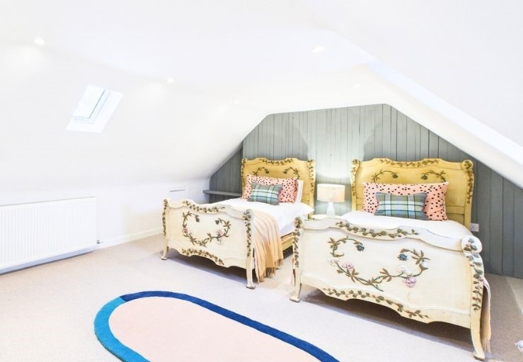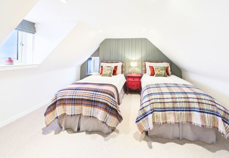 Follow the stairs to the next floor, passing a wonderful bookshelf on the right-hand side of the staircase and pick out your next read on your way to bed. On the top floor, a stairgate has been added for children’s safety and leads to two cosy twin rooms with skylight windows. The bedroom to the east holds views to the coast, and the bedroom to the west is opposite a handy bathroom with a large shower.