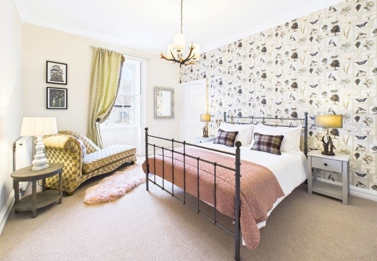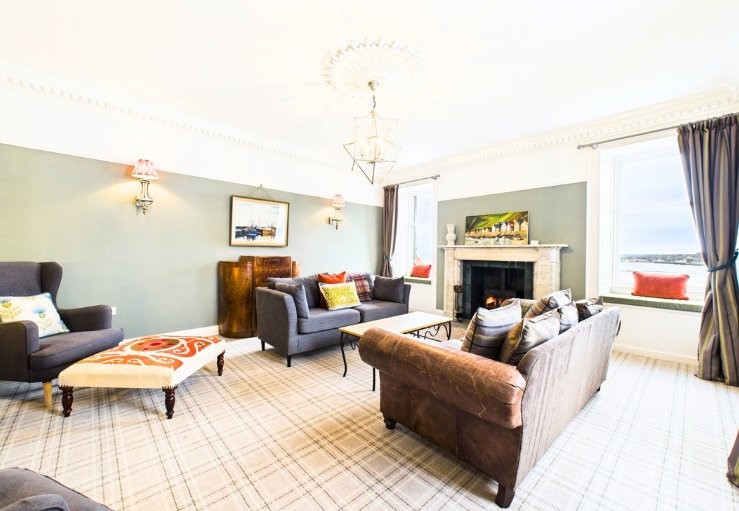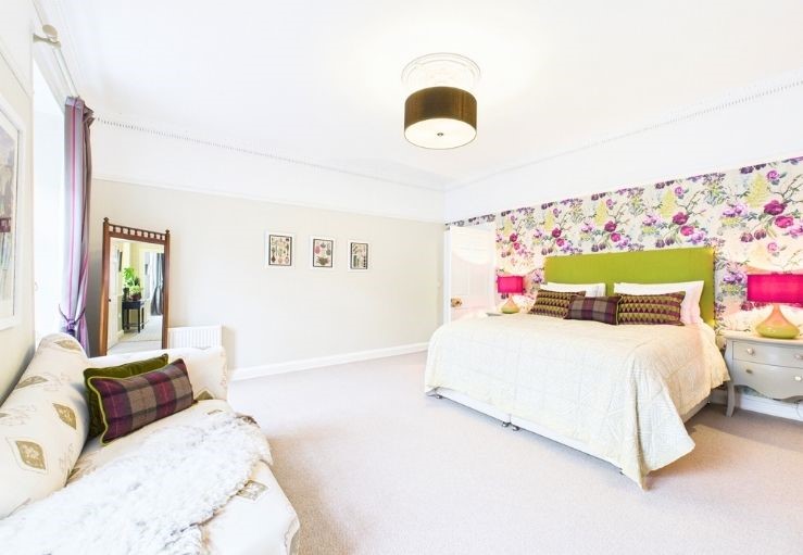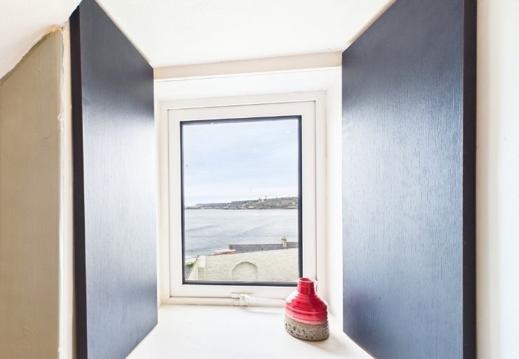 Make your way up the stairs, passing the beautiful stained-glass window which illuminates the hallway. On the right, you’ll find a super king-size bedroom and a king-size bedroom, both with luxurious chaise lounges. Opposite the bedrooms, the spacious lounge at the rear of the house is an idyllic communal space to rest in front of the cosy wood-burning stove and smart TV, also with comfy sofas and well-placed window seats looking out to the walled garden below and open sea beyond.