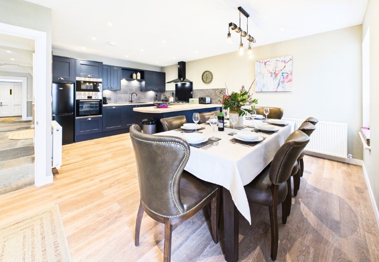 Follow the stairs to the first floor or continue to the family bathroom equipped with a large bath and separate shower. The combined spacious dining room and stylish kitchen is at the end of the hallway. There is ample seating for 8 guests, and it is very well equipped for cooking family meals or quickly throwing snacks into the air fryer before a day exploring Banff. Here, there is another external door leading to the walled garden. The garden has plenty of outdoor seating, a BBQ for summer evenings and is the perfect secure space for letting the dog out or for the kids to run around.