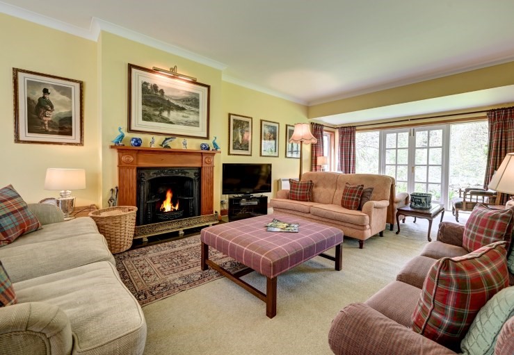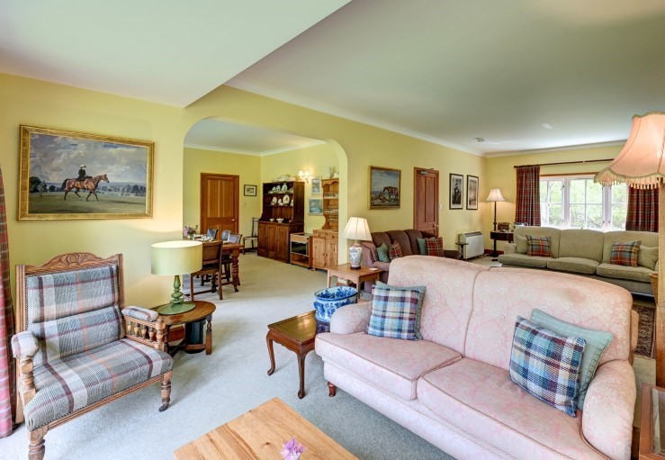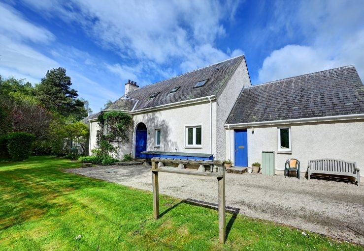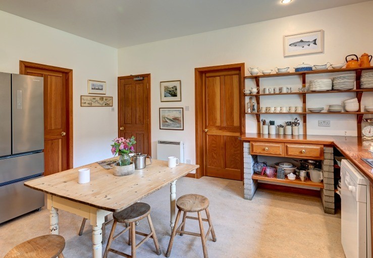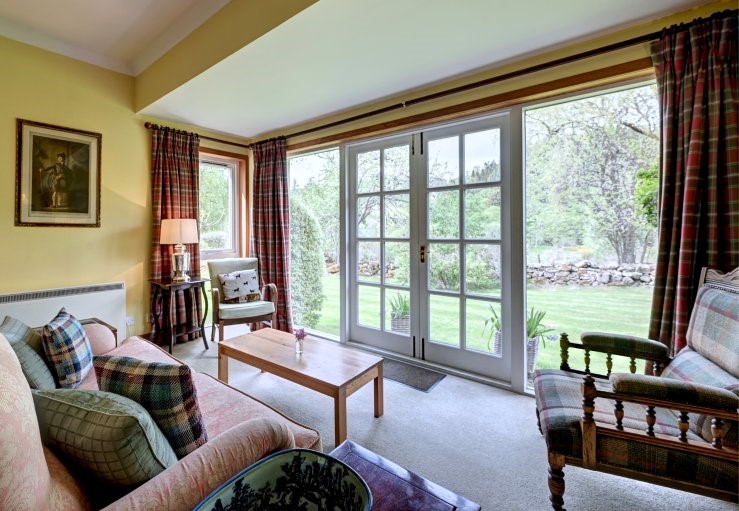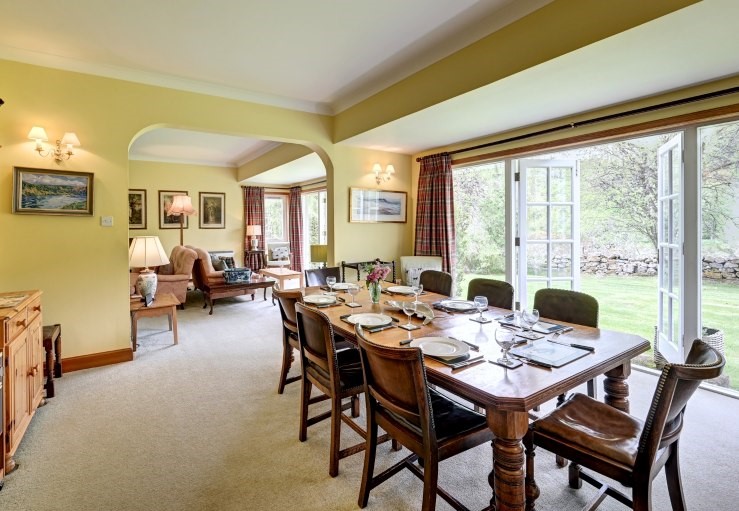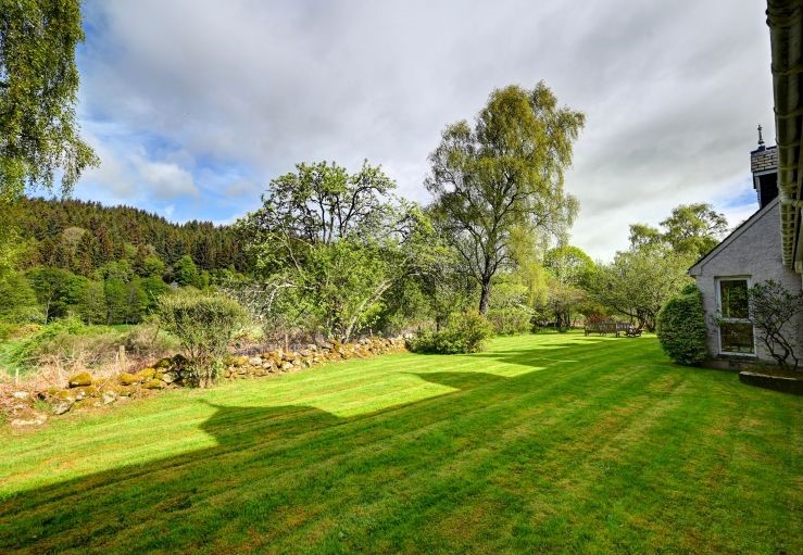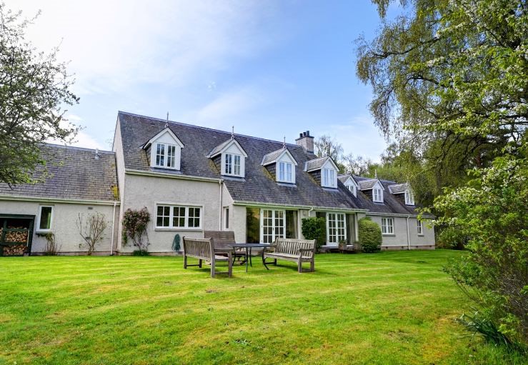 From the open-plan area, two sets of French doors lead into the garden space, opening the room to stunning views. The garden is enclosed and secure for letting pets wander and provided outdoor seating is ideal for dining al fresco or perching as you listen to the Spey rushing past. Also outdoors, there’s plenty of parking adjacent to Delagyle Lodge.
