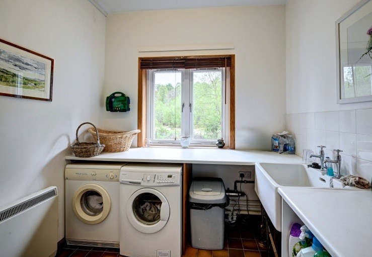 Utility room with washing machine, tumble dryer, dishwasher and wash basin