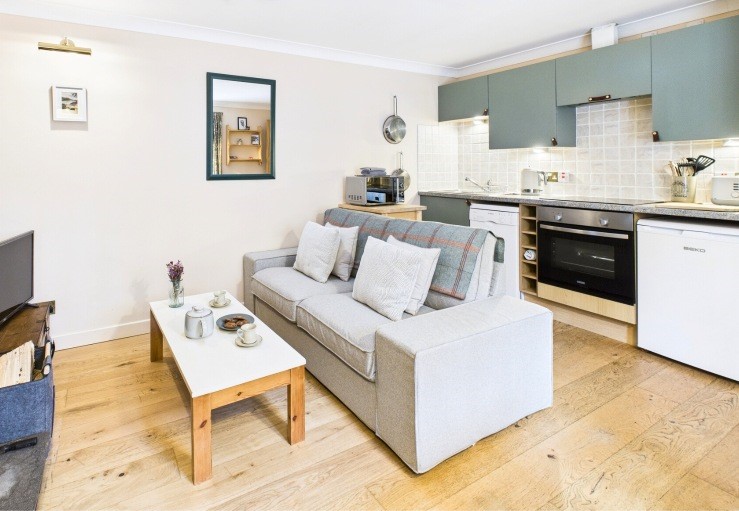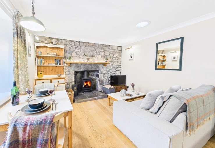 Open plan sitting/dining room/kitchen with wood burning stove, smart TV, electric hob and oven, dishwasher, microwave and fridge, etc.