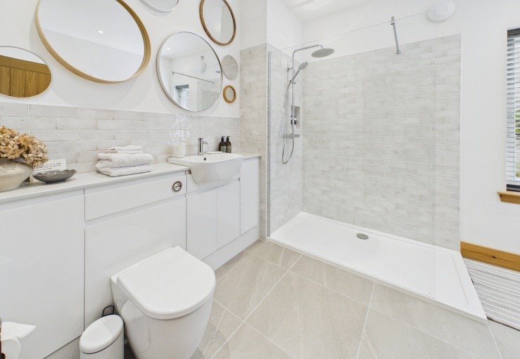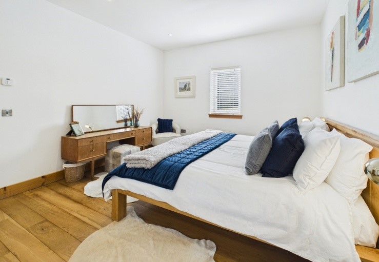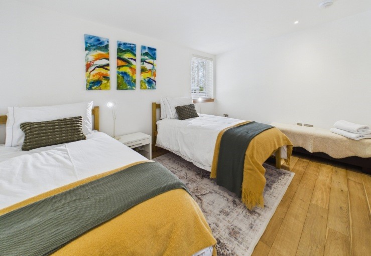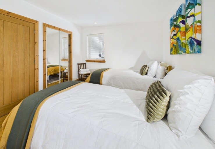 The vast shower room has metro-style tiles, a feature mirror wall and a large walk-in shower with a double head. The master bedroom features a super king-size bed, mirrored wardrobe and a handy dressing table. Adjacent is a twin bedroom, comfortably accommodating two, also with a mirrored wardrobe.