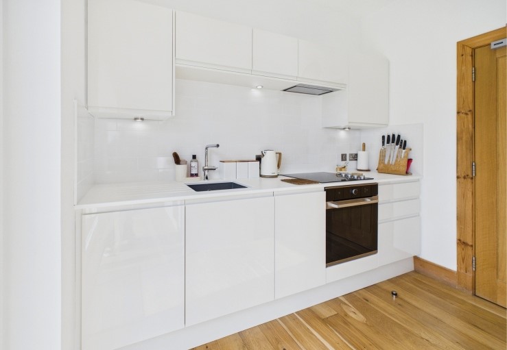 Open plan living area with wood-burning stove, Smart TV, ceramic hob, electric oven, small dishwasher, fridge/freezer and microwave