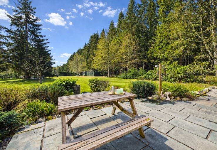 An external door from the kitchen opens to the patio area, with outdoor seating for dining al fresco, or simply relaxing and keeping an eye out for frequent visitors, red squirrels and birds snacking on the feeders.