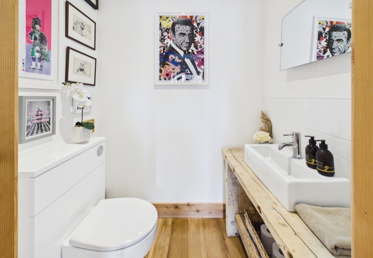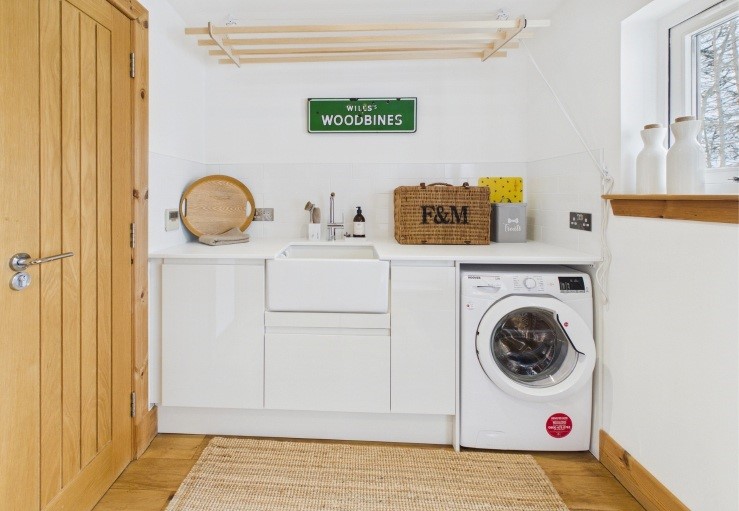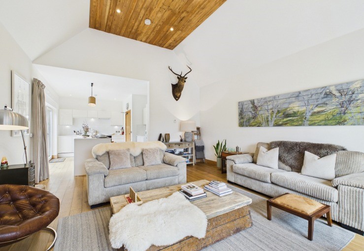 The main area highlights the dining island and open-plan living space with a vaulted ceiling, all kept warm by the central wood-burning stove. The Bothy is thoughtfully decorated with stylish furniture, such as the top of an old gym vault working as the coffee table. At the entrance, a utility room is equipped with a sink, washing machine and pulley, perfect for returning to after exploring the Cairngorms.