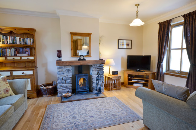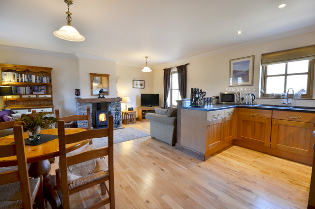 Sitting/dining room/kitchen with wood-burning stove, TV(Freesat)/DVD, electric oven and hob, microwave, dishwasher, fridge, etc.