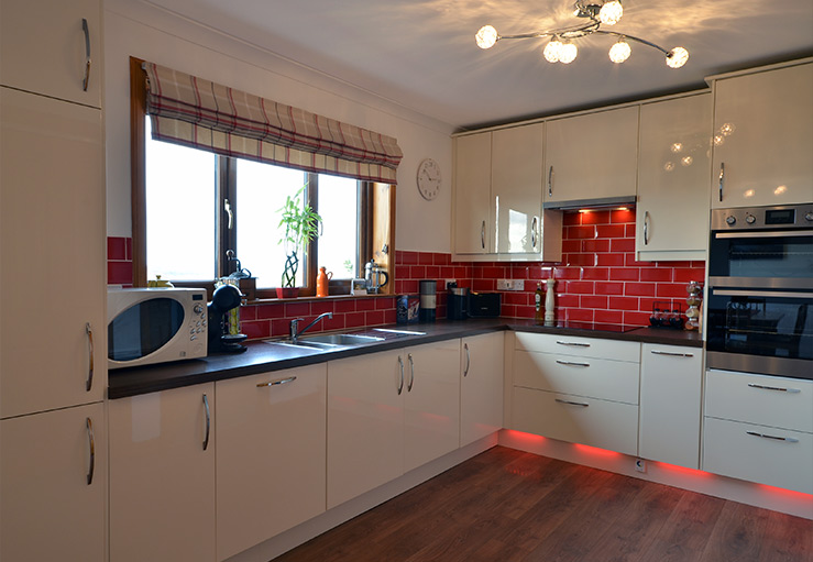 At the back of the house you can park right at the door and enter into the large, bright entrance hall that has handy storage for boots, coats, etc. From there, the sitting room has tasteful, comfortable seating and soft furnishings that add clever splashes of Scottish charm. There is a large flat screen Smart TV (includes Freesat) and a traditional stone fireplace with solid fuel stove (that supplements the oil central heating) to keep you cosy whilst you relax in front of it.