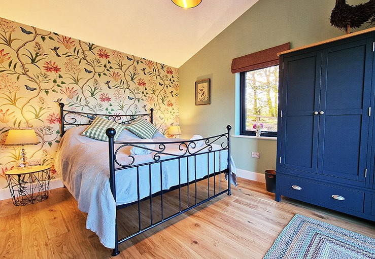 A cosy double bedroom with a king-size bed is set at one end, with sliding doors that open directly into the enclosed garden area. From here, there are west-facing views across the lawn and fields towards the Eildon Hills. The modern bathroom includes a generous walk-in shower and a separate bath, ideal for unwinding after a day out walking.