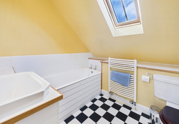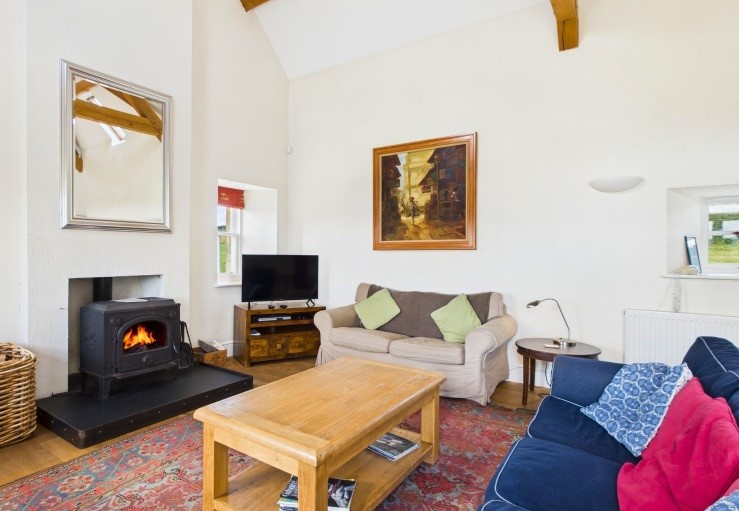 Inside the house is spacious and full of character and the elegant way it has been furnished and equipped cannot fail to please. The large open plan living area has a lovely beamed ceiling and a sitting area at one end with comfortable seating arranged around the wood-burning stove and TV. The dining area at the other end of the room has plenty of room for dining and the French doors out to the patio (with furniture and BBQ) keep the whole place bright by day and still cosy in the evening when the curtains are drawn.