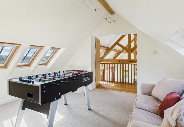 Open tread stairs lead up to two further twin bedrooms and another bathroom. There is also a games room with table football table leading through to a galleried TV room.