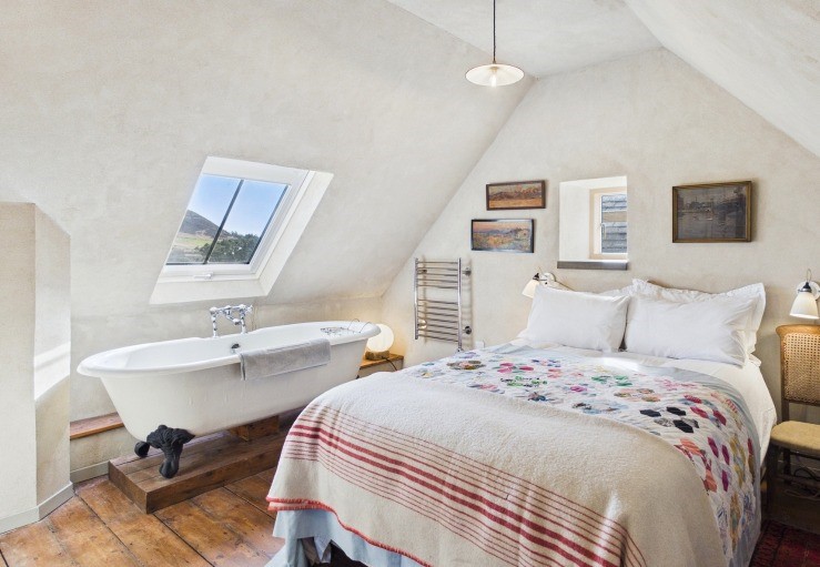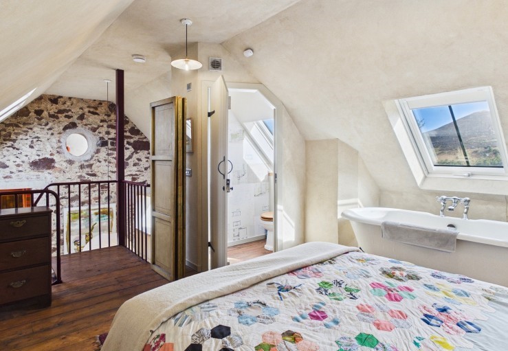 The second set of stairs in the sitting room leads up to another double bedroom, also featuring a small double bed, an en-suite WC, and an additional bath. Like the downstairs rooms, both bedrooms have a memorable view towards the Eildons.