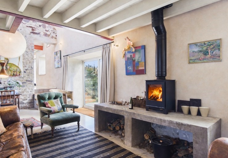 Open plan living area with wood-burning stove, Smart TV, electric oven, ceramic hob, fridge with ice box, washing machine, dishwasher and microwave