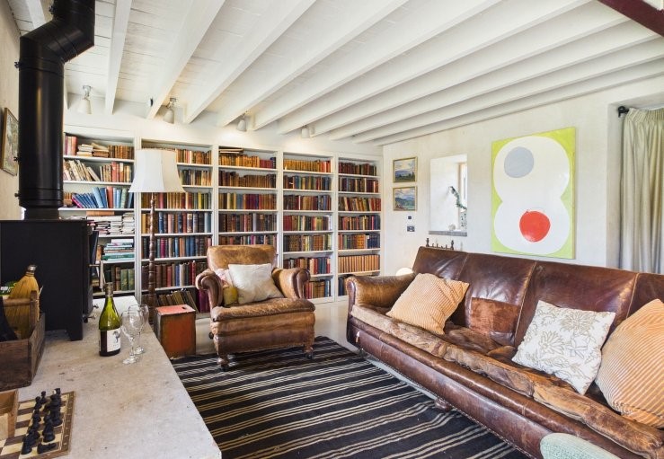 A beautifully large bookshelf covers the sitting room wall, where guests can choose their next evening read and stay cosy by the wood-burning stove. The space also highlights the nearby Eildon Hills through sliding doors, which lead into the garden.