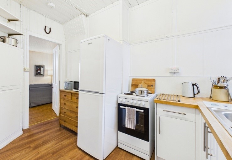 Kitchen with electric oven, ceramic hob, fridge/freezer and microwave