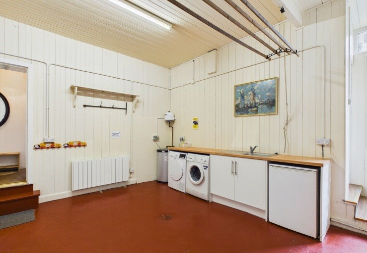 The entrance hallway leads to a vast utility space, great for storing bikes, golf clubs/ outdoor equipment, or letting the dog dry off after a dip in the sea. The room also features plenty of laundry facilities, including a traditional clothes dryer for drying clothes after coastal activities.