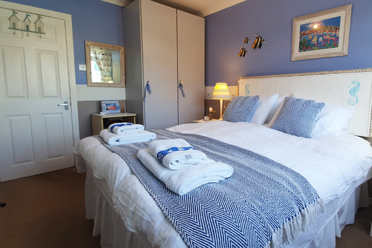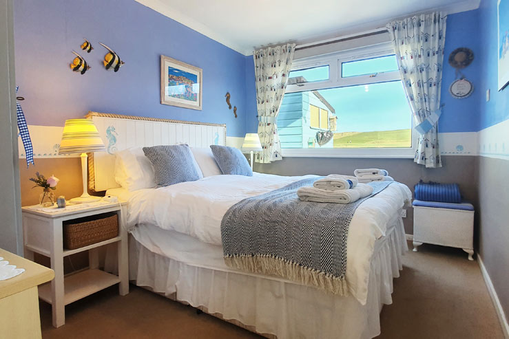 Perhaps Driftwood’s greatest charm is its décor, which throughout reflects its proximity to the sea. The colour scheme of blue and sunny yellow in the sitting area shades to a jaunty blue and white in the double bedroom and the shower room. It is all very bright and jolly, and puts you right in the mood for the beach outside.