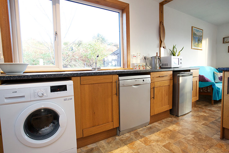 Open plan sitting/dining room/kitchen with small wood-burning stove, TV/DVD, electric cooker, dishwasher, microwave, fridge/freezer, washing machine and tumble dryer, etc (3 steps down to sitting room area)