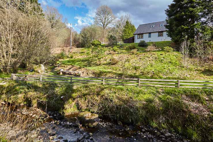 The cottage is reached by a single track road along the lochside so a car and early provisions are essential. There is a steep entrance driveway which leads to ample parking space at the front of the house where a handy ramp leads right up to the door. Secure storage is available for bikes, etc in the lean-to shed and the lawned garden with its mature trees and occasional seating slopes towards the Allt Gharbh burn (fenced, but care to be taken) which meanders down from the lochans at nearby An Suidhe.
