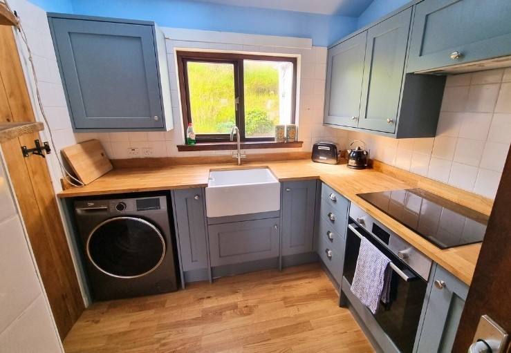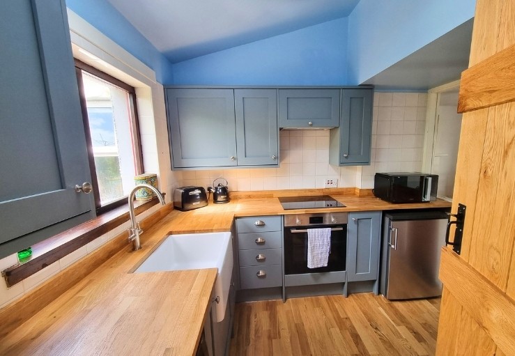 Coll Cottage has been renovated and modernised to embody an idyllic, cosy space required for a relaxing stay. The whitewashed, rustic exterior of the cottage opens to a communal space with oak laminate flooring and the homely warmth of a multi-fuel stove. Upon entering, you’re welcomed by a comfy seating area, a TV and a dining table. This room is the perfect communal space for family and friends to cosy up around the fire, have a warm cup of tea, or a hearty meal at the end of a thrilling day exploring the island.
