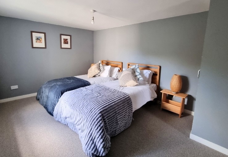 Surrounding the communal space are the bedrooms and kitchen. Tucked away to the left and right are the two bedrooms. The first bedroom features a relaxing King-size bed and a view of the magnificent Loch Eatharna to wake up to. The second bedroom is a twin room with a window looking out onto the enclosed garden area. Both bedrooms are augmented by oak frames on the beds and a luxury Herwick wool striped carpet that adds just that extra bit of comfort.
