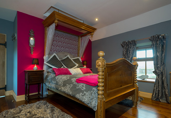 The romantic double bedroom is very warm and inviting with its rich furnishings and semi-canopied bed and the contemporary bathroom has the choice of a bath and shower over.