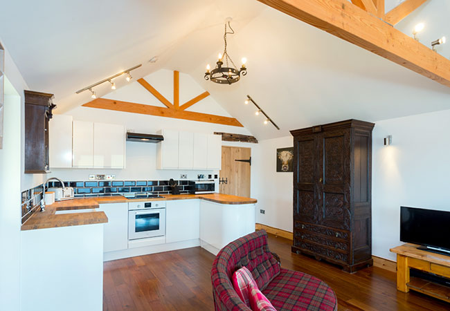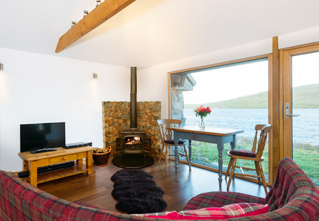 Inside the living accommodation is open plan and is dominated by a large picture window that really showcases the amazing view of the loch. The seating has been positioned to take advantage of the view and the cosy wood-burning stove, with a neat dining area alongside and modern kitchen behind.