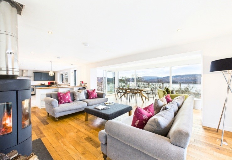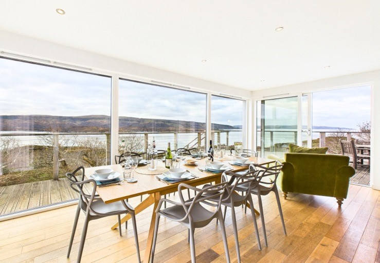 Tigh Na Creige, or ‘house on the crag’, sits in an elevated position on a rocky outcrop on the Ardnamurchan peninsula, surrounded by the waters of beautiful Loch Sunart with an enormous glass frontage that perfectly showcases its wonderful loch views.