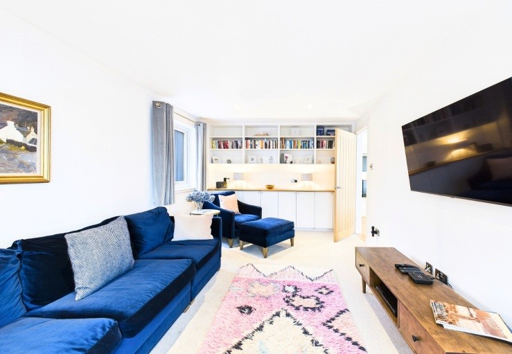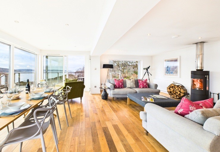 The huge dining table has been positioned to take the best advantage of the expansive and ever-changing view out towards the water. Cosy seating can be snuggled up on by the wood-burning stove and a telescope is set up at the window for wildlife spotting. The chic kitchen area is very well-equipped and an additional snug/TV room allows space to spread out into and differing viewing tastes to be catered for too!