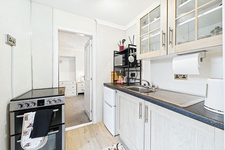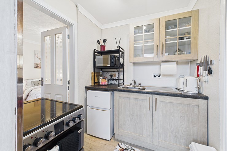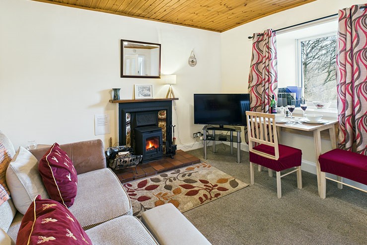 Sitting/dining room with TV and wood-burning stove. Small galley kitchen with electric oven and hob, microwave and small fridge/freezer, etc.