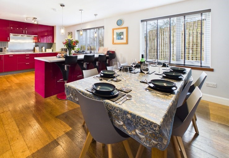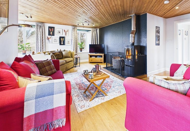 The lounge space features a wood burner set in the centre of the room, maximising cosiness, with comfortable seating surrounding it. The house is thoughtfully decorated throughout. There’s a handy addition of a small lift for those with limited ability, which can be enabled upon request. French doors lead out to the enclosed garden area, where guests can let pets roam.