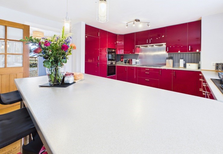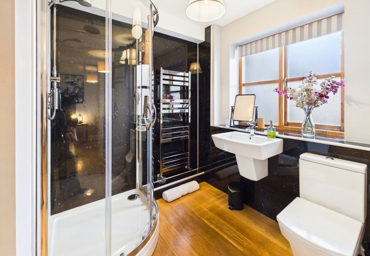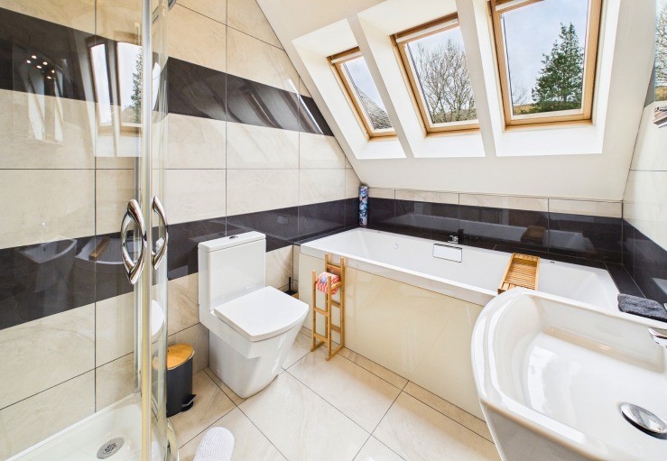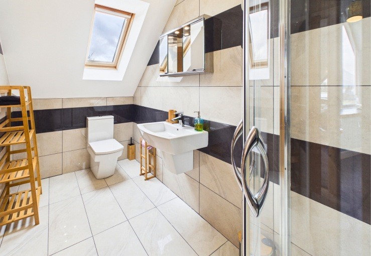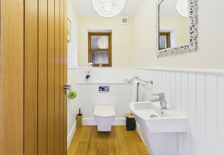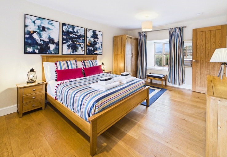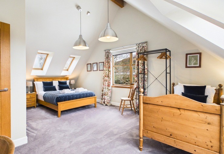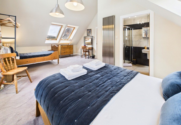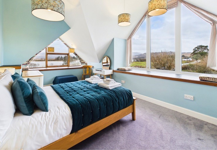 The property sleeps up to 8 guests in four spacious bedrooms. The first bedroom is found past the stairs, adjacent to the French doors. Three more double bedrooms are found upstairs, one being a family room with an extra single bed. Each bedroom has its own individual colour palette and style. The bedrooms are also all equipped with en-suites with a shower (one with an added bath) and Velux or large picture windows, showcasing the majestic landscapes. The cosy landing area upstairs has provided bean bags and other seating to enjoy vistas and lounge with your loved ones.