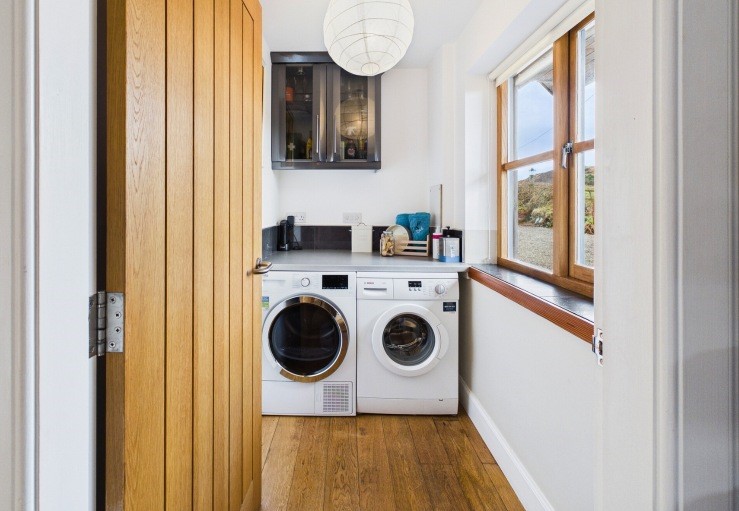 Guests enter immediately into a utility space, perfect for storing boots and coats after outdoor adventures, then through to the laundry facilities and handy downstairs WC. The extremely well-equipped kitchen is a joy to cook in, alongside the breakfast island and dining table, both of which provide plenty of seating for many hours to spend quality time together. Further seating can be found through the French doors to the covered outside sitooterie taking in the Ardnamurchan countryside.